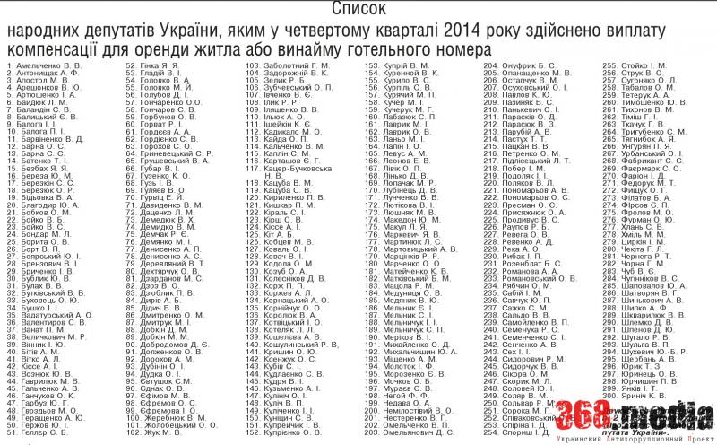 Газета Верховной рады «Голос Украины» обнародовала список из 300 народных избранников, которые в четвертом квартале 2014 года получили деньги за аренду жилья или съем гостиничного номера в столице. В число счастливчиков вошли одиннадцать одесских нардепов. Среди них оказались четверо любителей «Жить по-новому» из «Блока Петра Порошенко» — Алексей Гончаренко, Геннадий Чекита, Александр Урбанский и Дмитрий Голубов. Кроме них получили компенсацию члены фракции «Народный фронт» Сергей Фаермарк и Павел Унгурян. Также в список вошли Виталий Барвиненко, Антон Киссе, Александр Пресман и Василий Гуляев. Не по карману киевские апартаменты оказались и главному оппозиционеру — представителю фракции «Оппозиционный блок» Николаю Скорику.